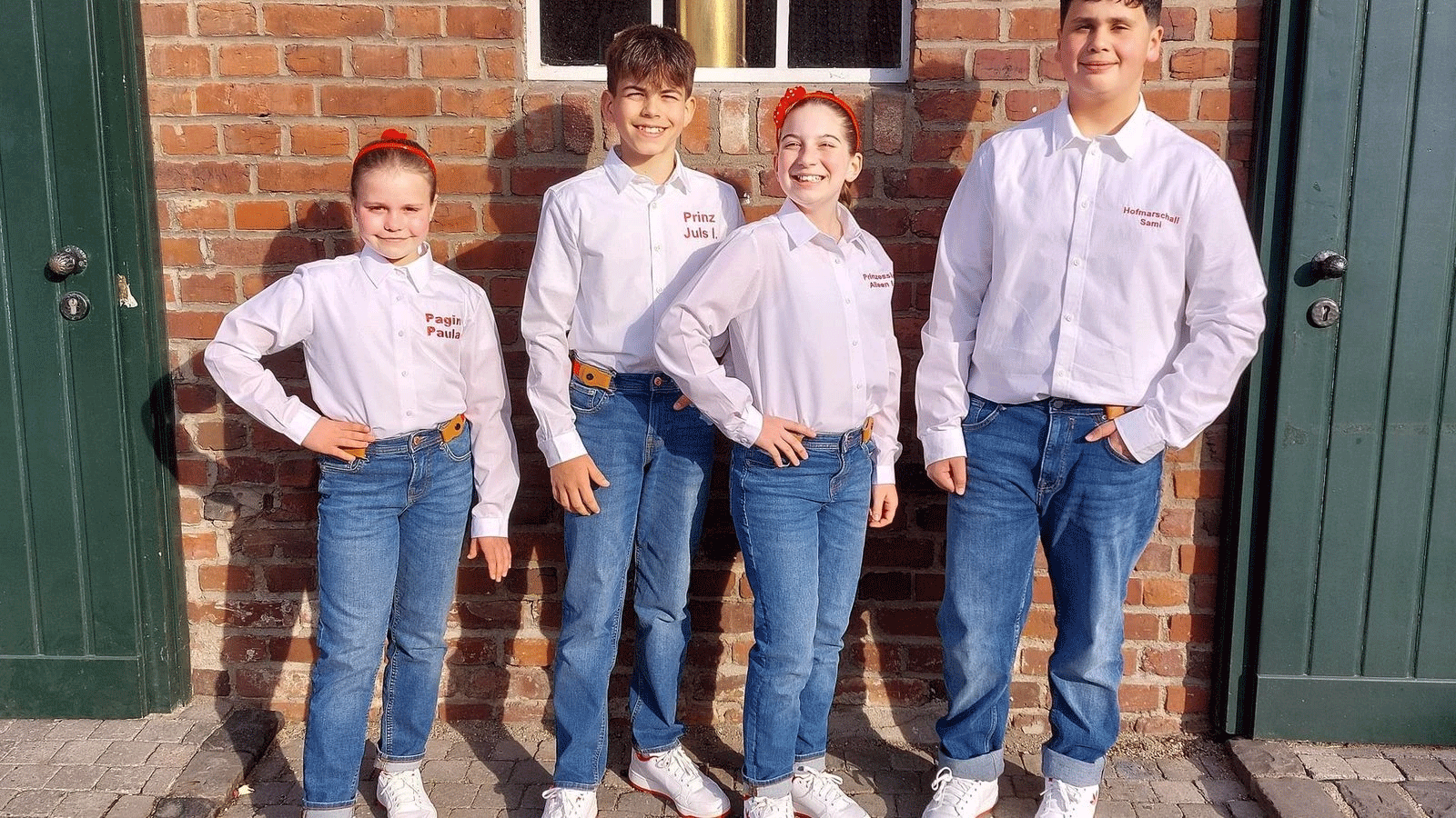 Sie sind Duisburgs neue Kinderprinzencrew (von links): Pagin Paula, Kinderprinz Juls, Prinzessin Aileen und Hofmarschall Sami. | ||