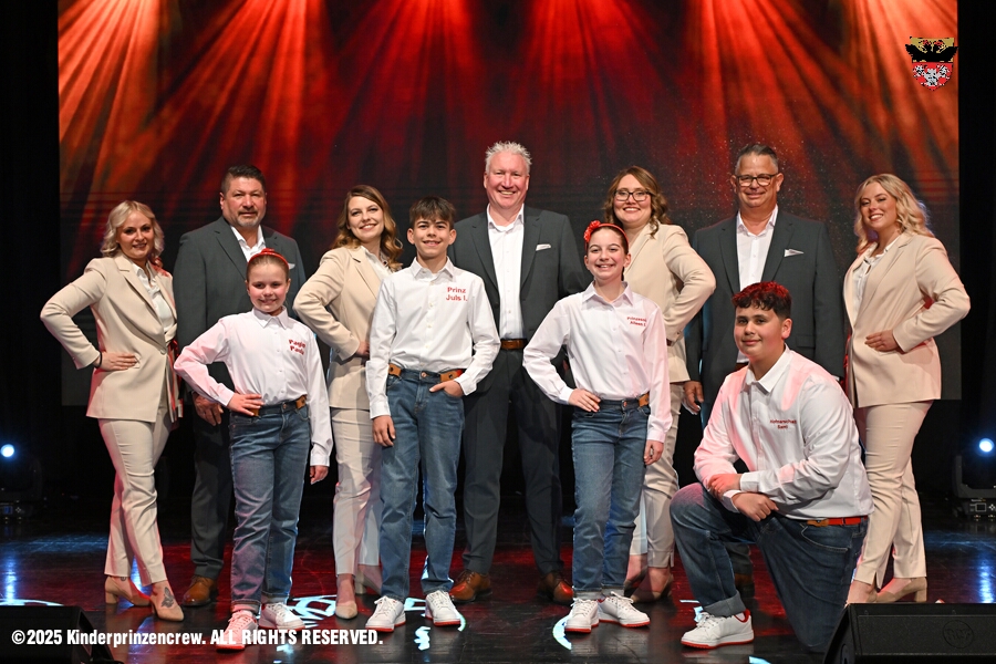 11 Prinzenwahl 2025 - Am Freitag 11. April 2025 ist endlich so weit. Vorstellung bei der Präsidentenversammlung. Nach einer kurzen Verschnaufpause dann die Erlösung, wir sind gewählt als Kinderprinzencrew der Session 2025 / 2026. Danach dann das erste mal, ohne unsere Kindergarde, nur wir vier allein, auf die Bühne im Steinhof. Wir wurden gefeiert, beschenkt und machten sehr viele Fotos. Hier auch nochmal einen herzlichen Glückwunsch an den des. Stadtprinzen Toni I. mit seiner Crew.