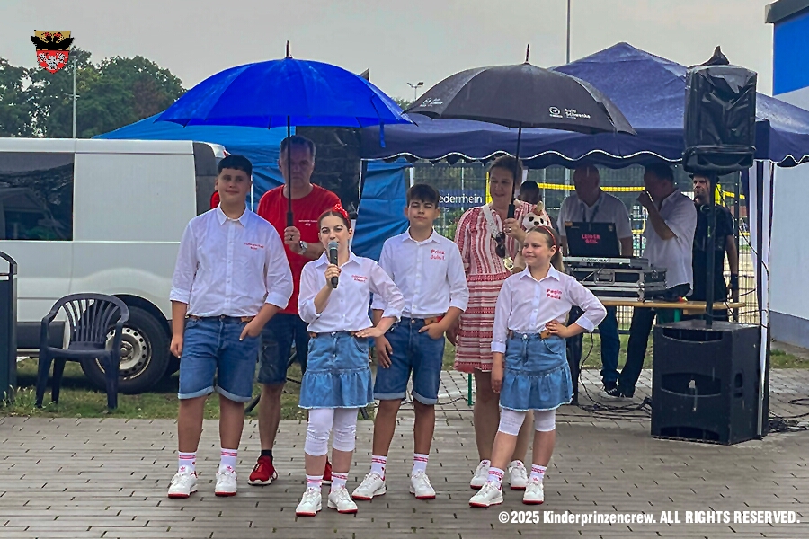 24 Kinderfest & Sommerfest - Unser erstes Ziel war in Hamborn das Helios St. Johannes Klinikum. Ein großes Kinderfest veranstaltete der Förderverein KiK – Kind im Krankenhaus - anlässlich seines 30jährigen Bestehens im Klinikgarten. Der zweite Termin war dann in Bissingheim auf der Sportanlage des ETUS Bissingheim. Wie schon im letzten Jahr fand dort das Sommerfest der KG Schottenzunft Duisburg statt. Zum letzten Termin, Sommerfest der Grafschafter Funken in Moers, wurde es ein wenig feucht von Oben. Aber kein Problem, wir standen unter „Schirmherrschaft“ von Katrin und Jörg.