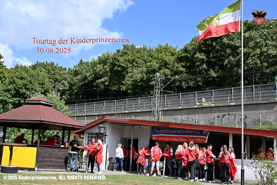 49 Tour-Tag 30. August - Gleich vier Sommerfeste standen auf dem Programm. Begonnen haben wir im Süden Duisburgs, natürlich bei der KG Sonniger-Süden. Dort starteten wir auch endlich mit dem Verkauf unserer Pins. Das nächste Ziel lag in Meiderich, das „Garde-Grillen“ der Duisburger Prinzengarde. Ein kurzer Besuch beim Kinderfest der KG Rote Funken lag auf dem Weg in den Westen Duisburgs zur 1. KG Baerl.