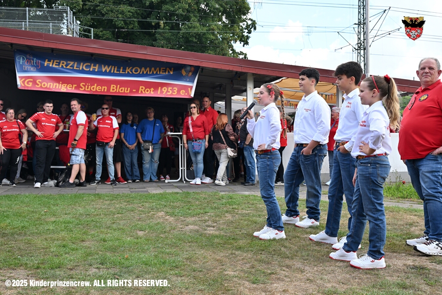 2 Tour-Tag 30. August - Gleich vier Sommerfeste standen auf dem Programm. Begonnen haben wir im Süden Duisburgs, natürlich bei der KG Sonniger-Süden. Dort starteten wir auch endlich mit dem Verkauf unserer Pins. Das nächste Ziel lag in Meiderich, das „Garde-Grillen“ der Duisburger Prinzengarde. Ein kurzer Besuch beim Kinderfest der KG Rote Funken lag auf dem Weg in den Westen Duisburgs zur 1. KG Baerl.
