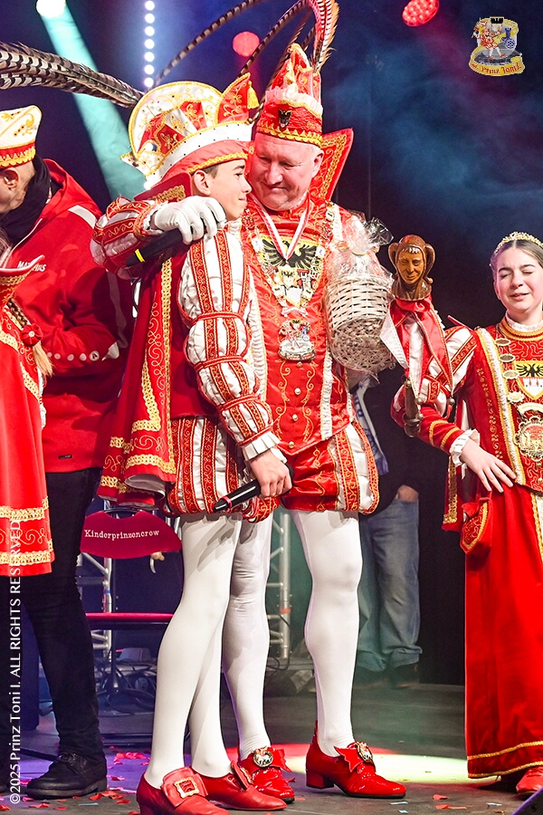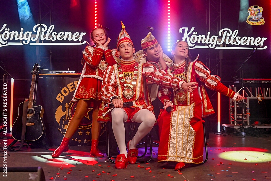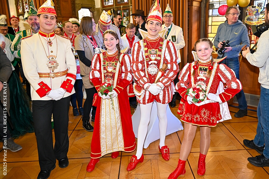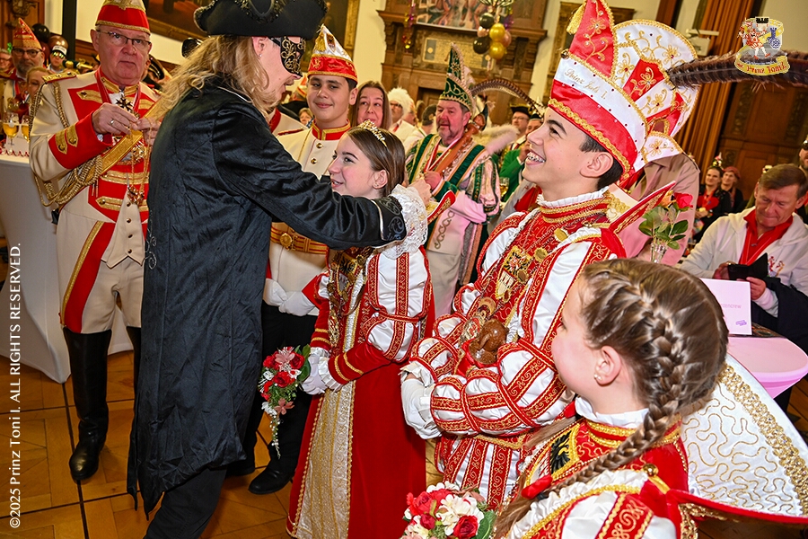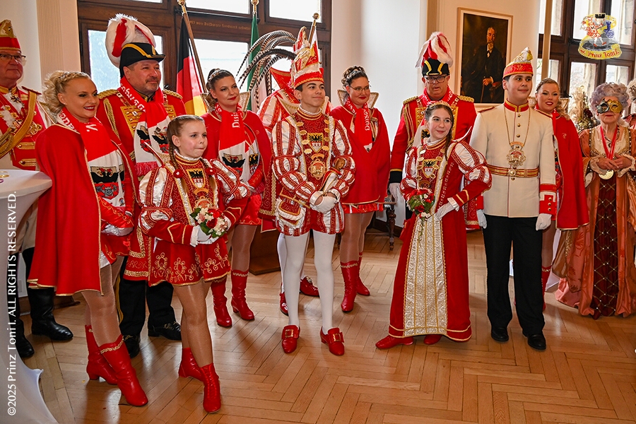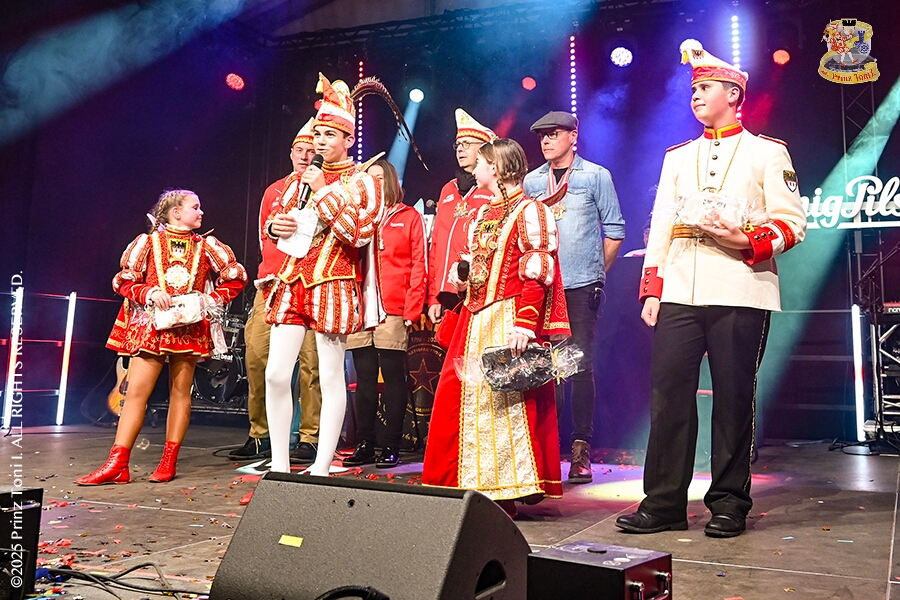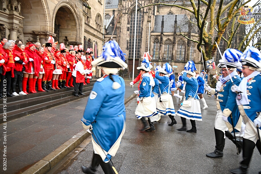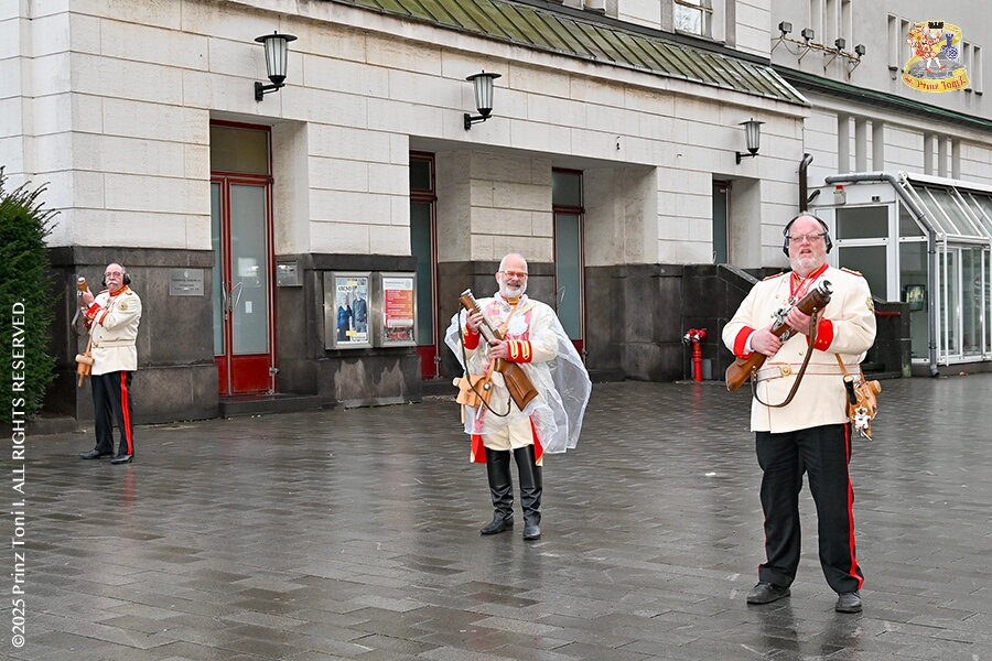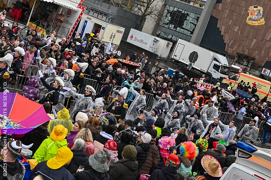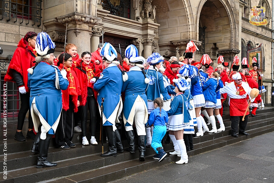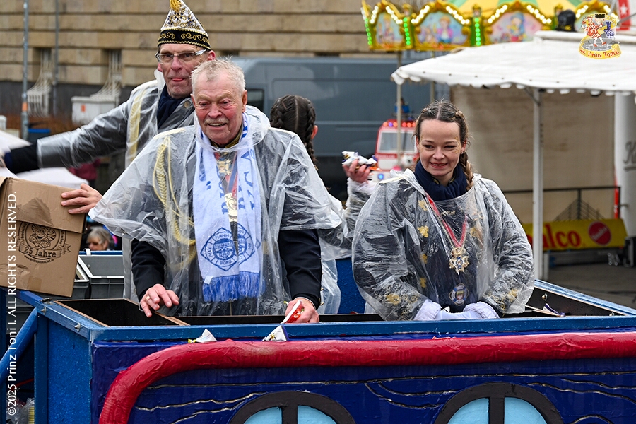 25 Rosenmontag 2026 - Es war eigentlich ein toller Tag, wenn nur das Wetter mitgespielt hätte. Beim Wecken von Prinz Toni I. vor dem WYNDHAM Hotel Duisburger Hof war es schon recht ungemütlich. Danach dann ein paar warme Stunden in unserem Rat, beim Prinzenwecken mit OB Sören Link. Pünktlich zum Start des Rosenmontagszugs geht es los mit dem Regen, bis auf kurze Momente hielt er an bis zum Ende des Zuges. Nachdem sich Alle im König Pilsener Festzelt auf gewärmt hatten, kamen auf der Bühne die Verabschiedung von uns, der Kinderprinzencrew 2026, und Prinz Toni I.