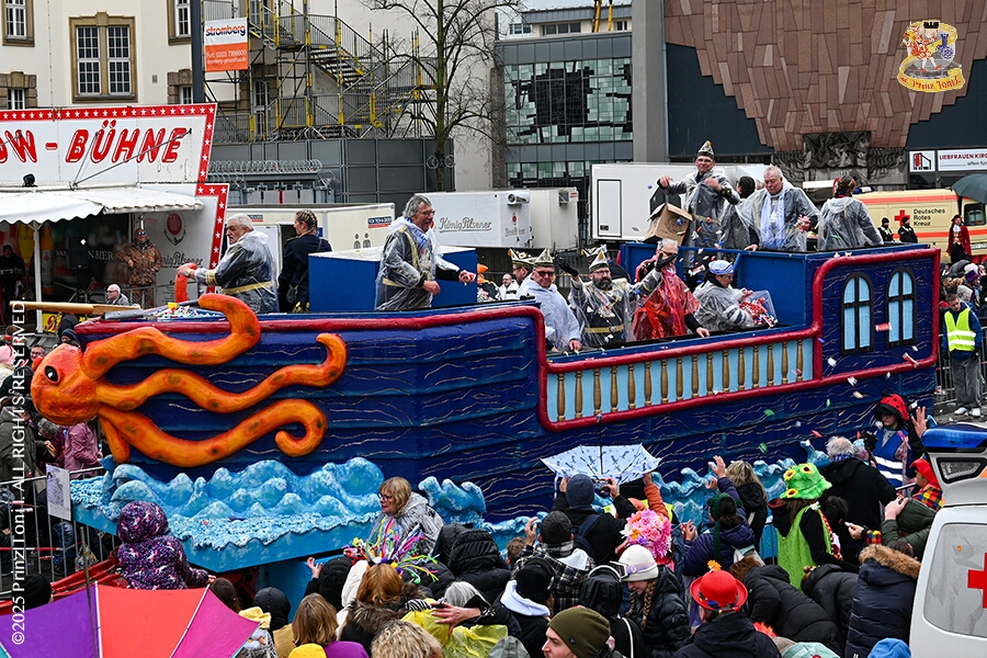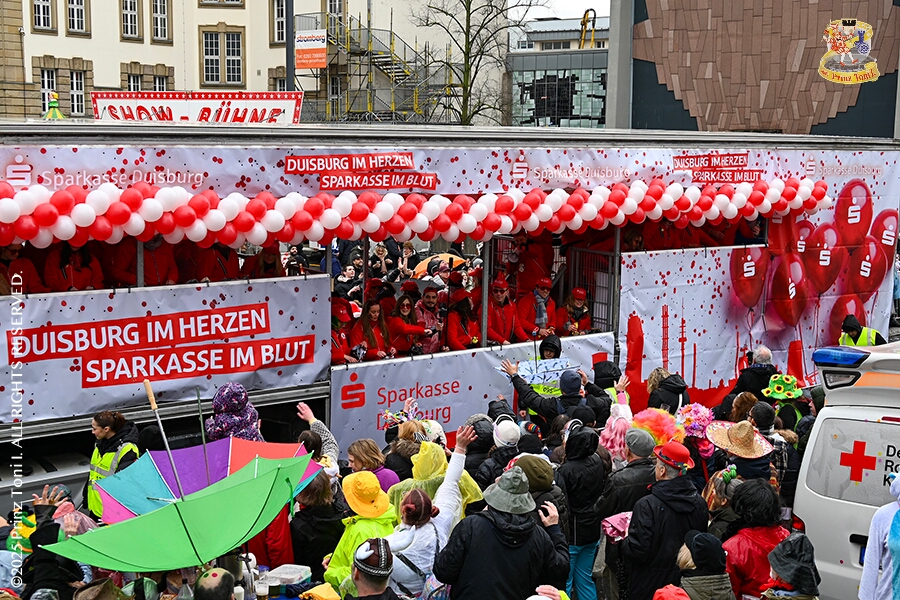 41 Rosenmontag 2026 - Es war eigentlich ein toller Tag, wenn nur das Wetter mitgespielt hätte. Beim Wecken von Prinz Toni I. vor dem WYNDHAM Hotel Duisburger Hof war es schon recht ungemütlich. Danach dann ein paar warme Stunden in unserem Rat, beim Prinzenwecken mit OB Sören Link. Pünktlich zum Start des Rosenmontagszugs geht es los mit dem Regen, bis auf kurze Momente hielt er an bis zum Ende des Zuges. Nachdem sich Alle im König Pilsener Festzelt auf gewärmt hatten, kamen auf der Bühne die Verabschiedung von uns, der Kinderprinzencrew 2026, und Prinz Toni I.