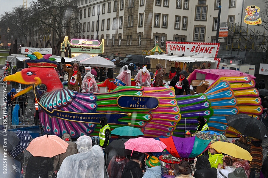 37 Rosenmontag 2026 - Es war eigentlich ein toller Tag, wenn nur das Wetter mitgespielt hätte. Beim Wecken von Prinz Toni I. vor dem WYNDHAM Hotel Duisburger Hof war es schon recht ungemütlich. Danach dann ein paar warme Stunden in unserem Rat, beim Prinzenwecken mit OB Sören Link. Pünktlich zum Start des Rosenmontagszugs geht es los mit dem Regen, bis auf kurze Momente hielt er an bis zum Ende des Zuges. Nachdem sich Alle im König Pilsener Festzelt auf gewärmt hatten, kamen auf der Bühne die Verabschiedung von uns, der Kinderprinzencrew 2026, und Prinz Toni I.