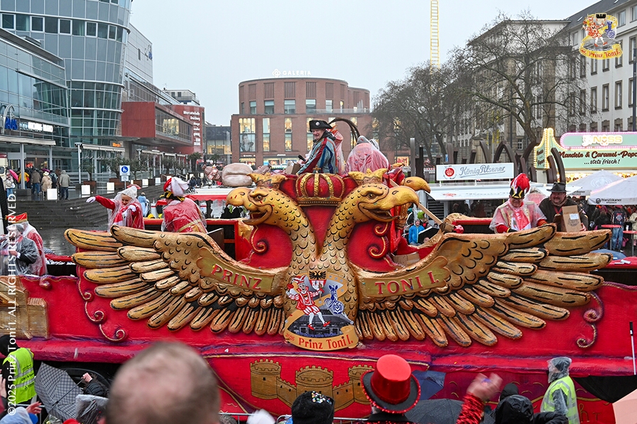 23 Rosenmontag 2026 - Es war eigentlich ein toller Tag, wenn nur das Wetter mitgespielt hätte. Beim Wecken von Prinz Toni I. vor dem WYNDHAM Hotel Duisburger Hof war es schon recht ungemütlich. Danach dann ein paar warme Stunden in unserem Rat, beim Prinzenwecken mit OB Sören Link. Pünktlich zum Start des Rosenmontagszugs geht es los mit dem Regen, bis auf kurze Momente hielt er an bis zum Ende des Zuges. Nachdem sich Alle im König Pilsener Festzelt auf gewärmt hatten, kamen auf der Bühne die Verabschiedung von uns, der Kinderprinzencrew 2026, und Prinz Toni I.